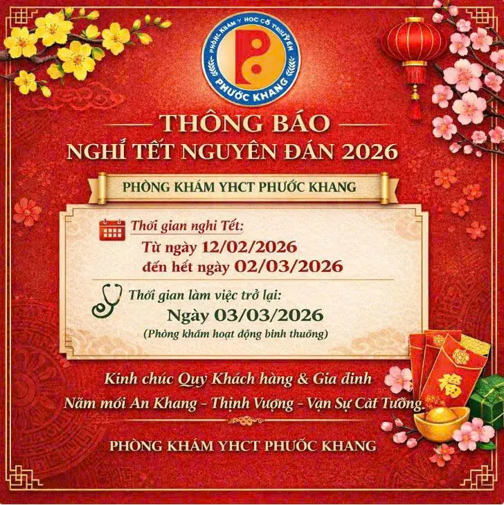 Bên cạnh hoạt động kỷ niệm Ngày Thầy Thuốc Việt Nam 27/2, Phòng khám YHCT Phước Khang xin trân trọng thông báo lịch nghỉ Tết Nguyên Đán 2026 như sau:
